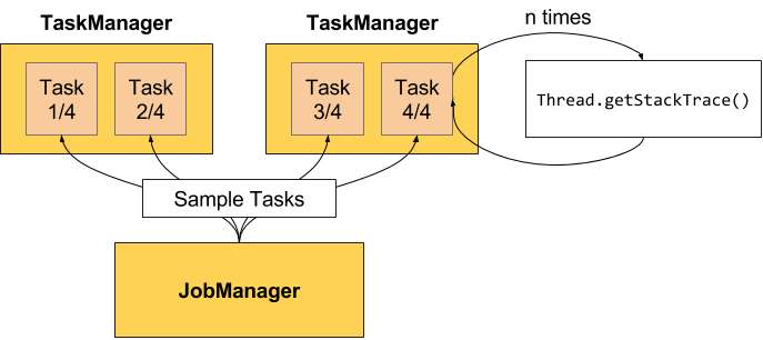 背压监测通过反复获取正在运行的任务的堆栈跟踪样本来工作。JobManager会触发对作业Thread.getStackTrace()任务的重复调用。