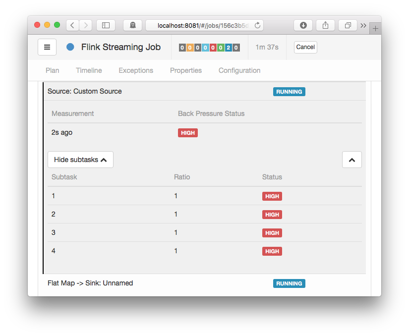 如果您看到任务的状态正常,则表示没有背压指示。另一方面,HIGH意味着任务被加压。