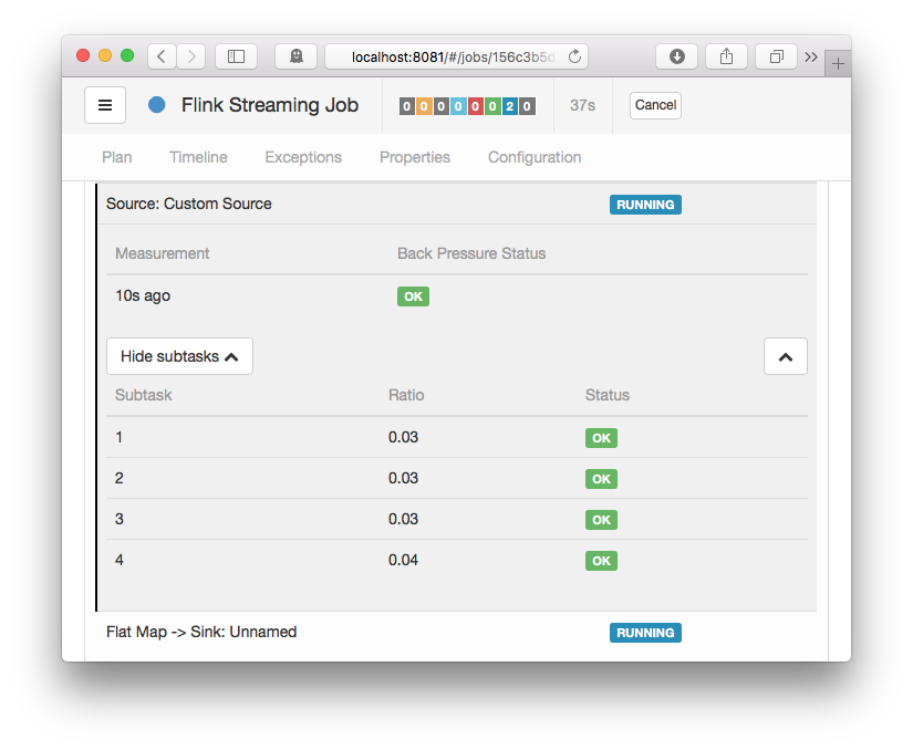 这意味着JobManager触发了正在运行的任务的堆栈跟踪示例。使用默认配置,大约需要5秒钟才能完成。