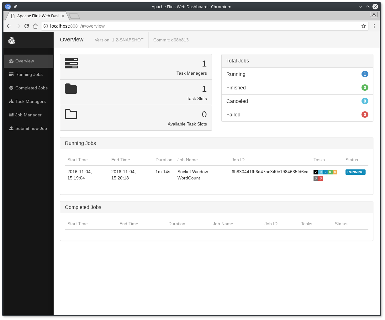检查分派器的web前端在HTTP://localhost:8081,并确保一切都正常运行。Web前端应报告单个可用的TaskManager实例。