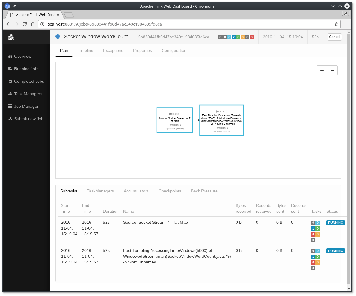 程序连接到套接字并等待输入。您可以检查Web界面以验证作业是否按预期运行: